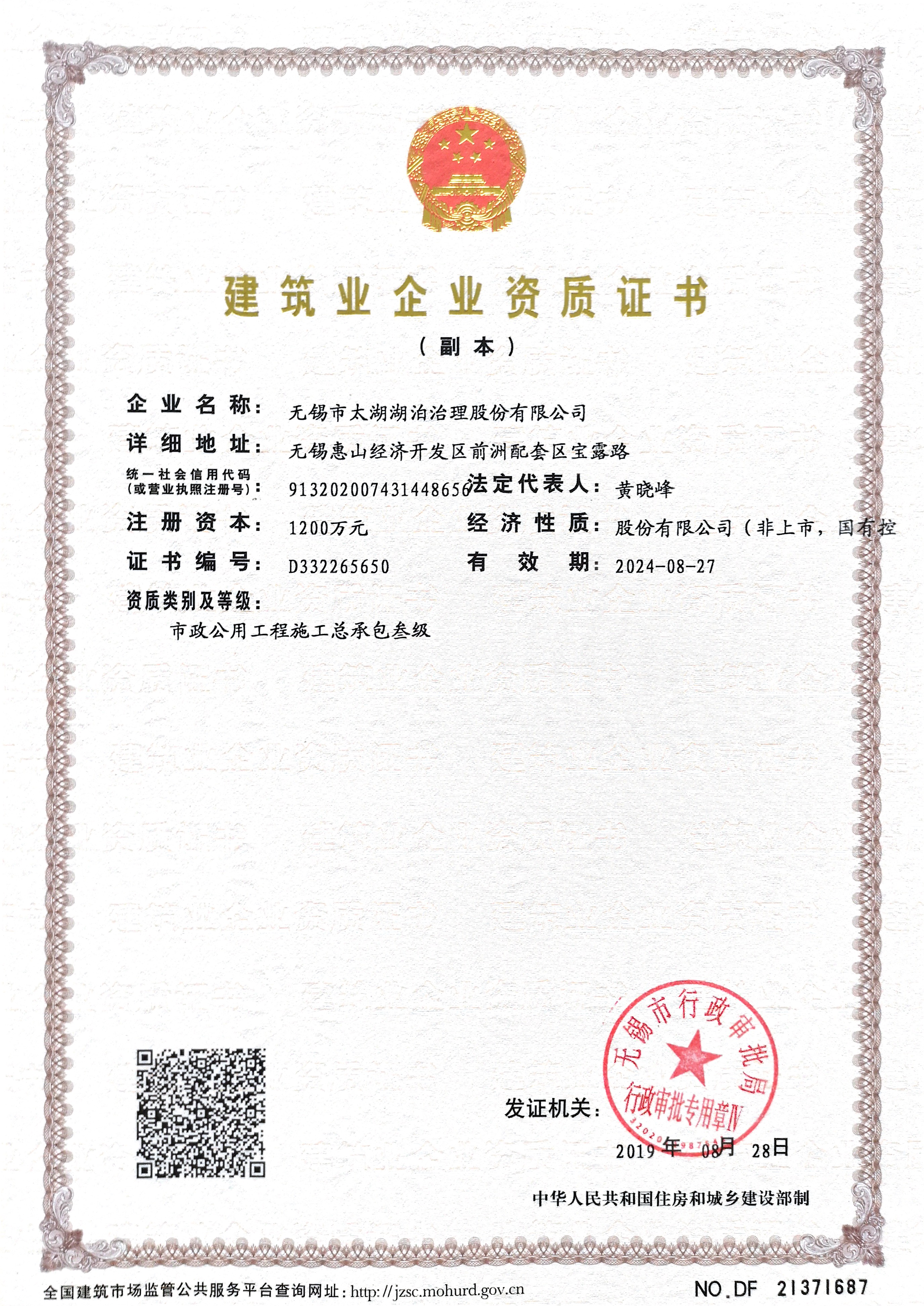 湖泊公司榮升環(huán)保工程專業(yè)承包貳級(jí)資質(zhì)